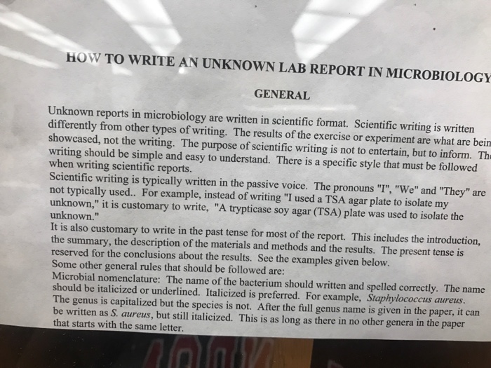 For example instead of writing I used a TSA agar plate to isolate my unknown it is customary to write A trypticase soy agar TSA plate was used to isolate the unknown It is also customary to write in. UNKNOWN LAB REPORT. Most microbiology lab reports do not have an Introduction and begin with the Purpose section.